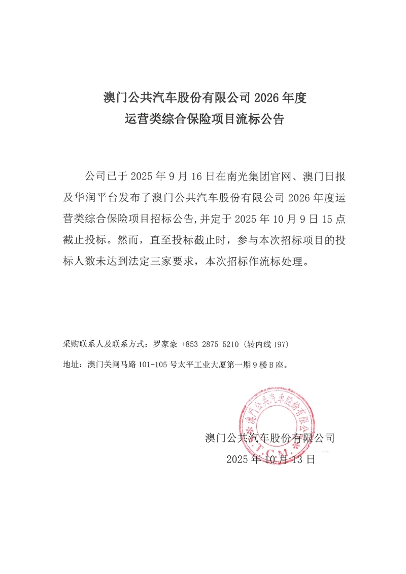 澳門公共汽車股份有限公司2026年度運營類綜合保險項目流標公告-蓋章版.pdf