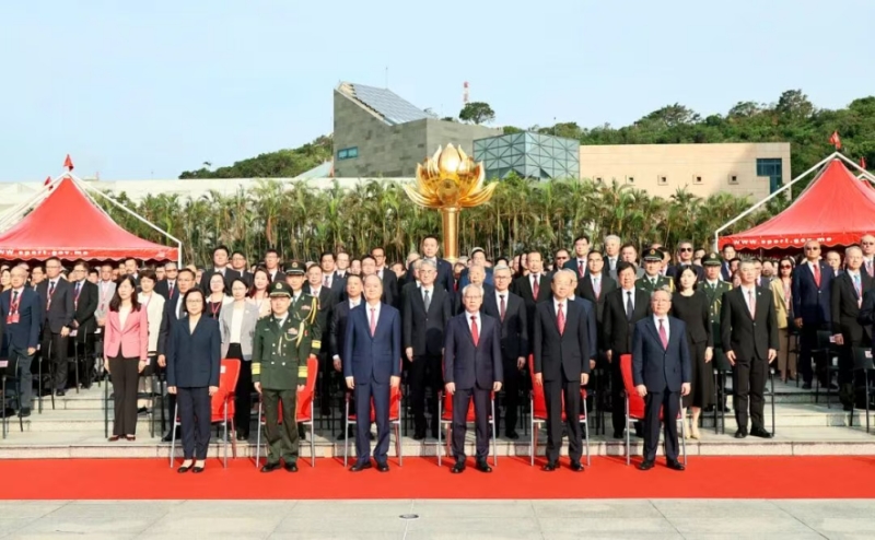 上午8時(shí)整,澳門特區(qū)政府在金蓮花廣場(chǎng)舉行慶祝中華人民共和國(guó)成立76周年升旗儀式。行政長(zhǎng)官岑浩輝,澳門中聯(lián)辦主任鄭新聰,外交部駐澳門特派員公署特派員劉顯法,解放軍駐澳門部隊(duì)政委林慶華,澳門立法會(huì)主席高開賢,澳門終審法院代院長(zhǎng)宋敏莉,以及澳門特區(qū)政府主要官員、立法及司法機(jī)構(gòu)負(fù)責(zé)人,澳區(qū)全國(guó)人大代表、政協(xié)委員,中央駐澳機(jī)構(gòu)代表和社會(huì)各界人士等出席。